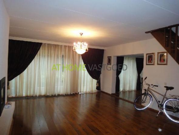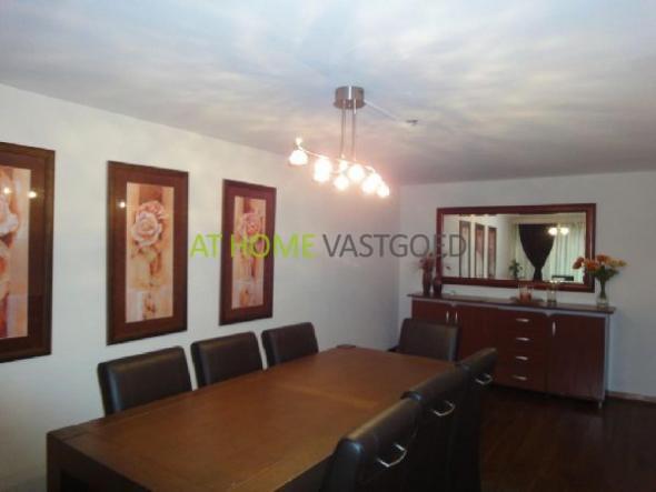 Vanuit de hal komt u in de ruime woonkamer die voorzien is van, een prachtige houten vloer die een mooi kersen kleurig is.Vanuit deze ruime woonkamer komt u in de royale eetkamer die voorzien is van een prachtige eethoek van hout met grote leren stoelen en een mooie dressoir kast met spiegel.