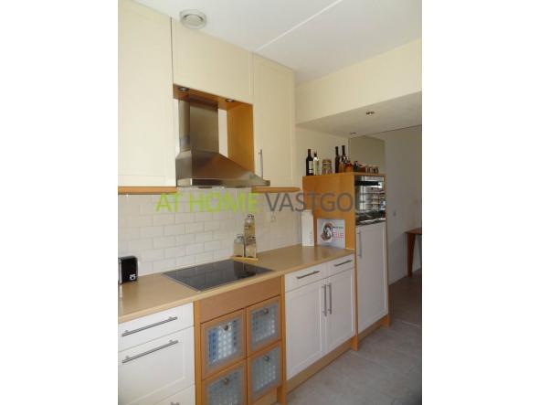 De open keuken in hoekopstelling is voorzien van een keramische kookplaat, combimagnetron, koelkast en RVS afzuigkap.