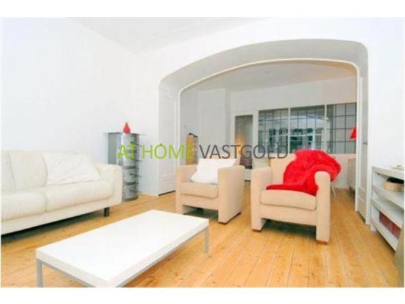 De licht geschilderde en riante woonkamer met veel lichtinval is gelegen aan de voorzijde en voorzien van originele houtenvloer en 3 ruime inbouwkasten.