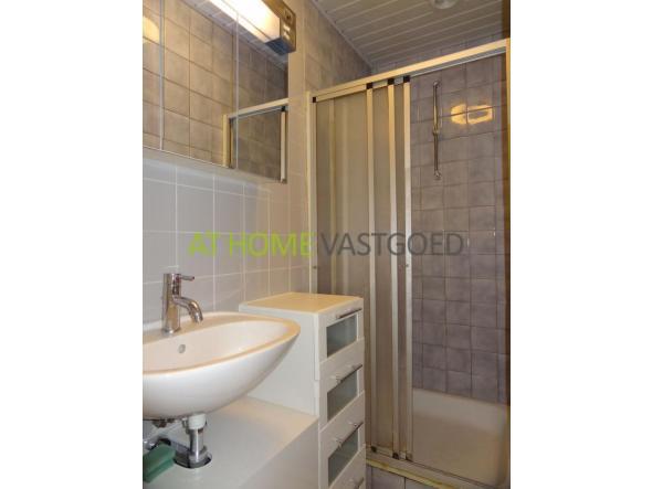 De badkamer heeft een wastafel met onder tafel, twee kasten en een douche met douchebak. Uiteraard is de badkamer voorzien van ventilatie.