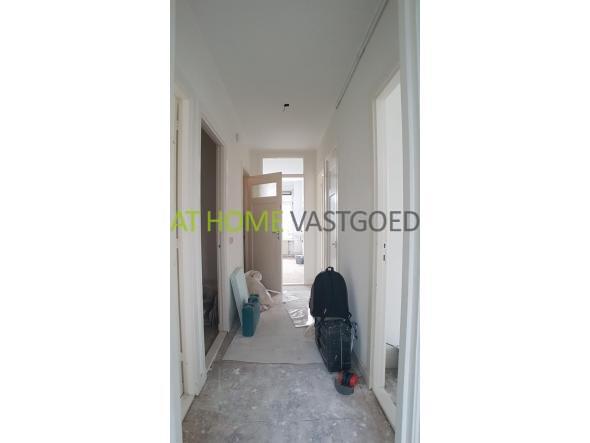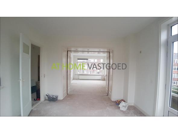 Hal met toegang naar alle vertrekken op de 1e etage. Zeer ruime woonkamer met 4 inbouwkasten en aan de achterzijde 2 balkons. Doormiddel van ensuite deuren is de woonkamer op te splitsen in een woonkamer met aparte eetgedeelte. De prachtige en splinternieuwe keuken is voorzien van een luxe roestvrijstalen gaskookplaat, afzuigkap en aansluiting voor een vaatwasser. Aan de achterzijde van de 1e verdieping bevindt zich een slaapkamer met wastafel. Aan de voorzijde van de 1e verdieping bevindt zich een ruime slaapkamer ook hier is een wastafel aanwezig. De douche en het aparte toilet op de 1e verdieping zijn volledig vernieuwd.