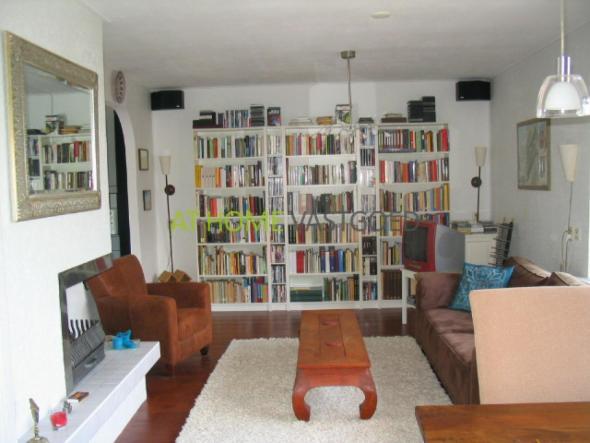 Woonkamer (26 m2) met open haard en toegang naar de open keuken (6m2) voorzien van koel/vriescombinatie, vaatwasser,keukenboiler, keramische kookplaat en afzuigkap.
