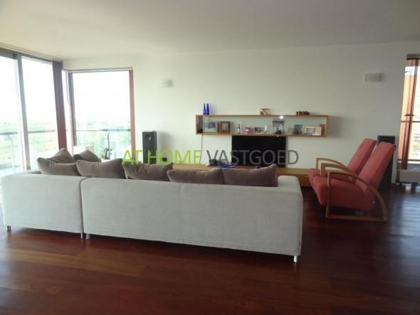 Royale living van 70 m2 met een magnifiek panoramisch uitzicht. Aan de voorzijde kan de schuifpui open gezet worden.