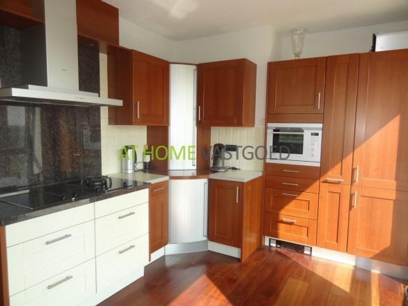 Luxe half open keuken met vaatwasser, brede oven, 4 pits kookplaat, afzuigschouw, magnetron, spoelbak, koelkast en een grote diversiteit aan kasten.
