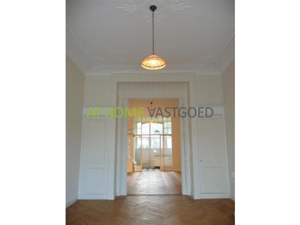 1e verdieping: entree, ruime woonkamer met originele ornamenten plafonds. De woonkamer ensuite is af te scheiden via schuifdeuren en heeft een klassieke (sier) open haard. De oppervlakte van de woonkamer is ongeveer 50 m2 en geeft toegang aan zowel de aparte keuken als aan de twee slaapkamers. De af te scheiden moderne keuken is voorzien van een Amerikaanse koelkast, keramische kookplaat en een afzuigkap. De badkamer is vanuit de slaapkamer aan de achterzijde te betreden en beschikt over een dubbele wastafel, toilet, ligbad, douchecabine, wasmachine en droger. Het balkon is via de slaapkamer te bereiken.