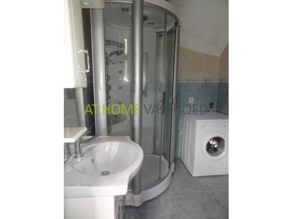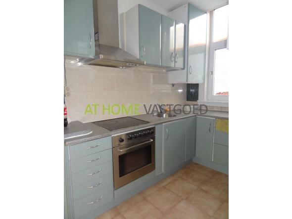 Trap naar de 1e etage: grote, lichte woonkamer met aangrenzende keuken voorzien van afzuigkap, kookplaat ,oven, en koelkast. Nette betegelde badkamer met douche, wastafel en toilet