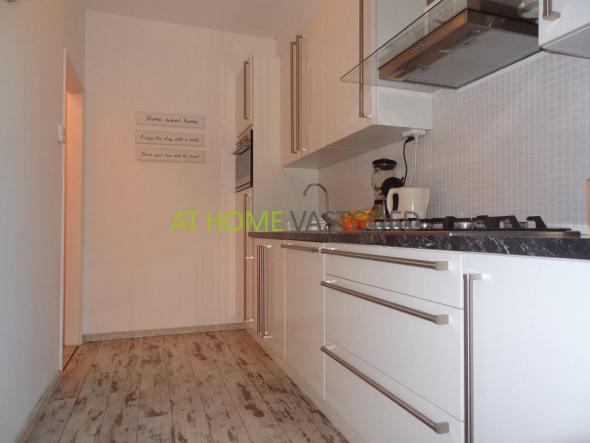 Strakke moderne keuken uitgerust met een vaatwasser, koel- en vrieskast, oven, 5-pits gaskookplaat en afzuigkap. De keuken biedt tevens toegang tot het balkon aan de achterzijde.