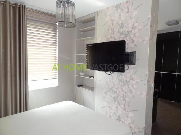 Middels een ingenieus schuifdeuren systeem bereikt u de studykamer/inloopkast met luxe bureau. De slaapkamer is voorzien van tweepersoonsbed en TV.