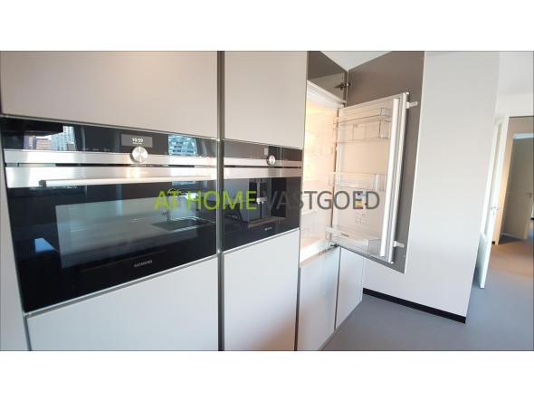 Ruime lichte woonkamer met nieuw modern meubilair en fenomenaal uitzicht op o.a. de Markthal. Nieuwe open keuken met kookeiland en Siemens inbouwapparatuur zoals: inductie kookplaat, afzuigkap, koelkast, oven, vaatwasser en inbouw koffiemachine.