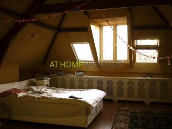 Overloop. Grootse slaapkamer (ca. 38m²!) met schuine dakvlakken en gezellig zichtbare balkenconstructie tot aan de hoge nok. Slaapkamer (ca. 20m²). Badkamer met ligbad, douche, wastafel in meubel en hangcloset.
