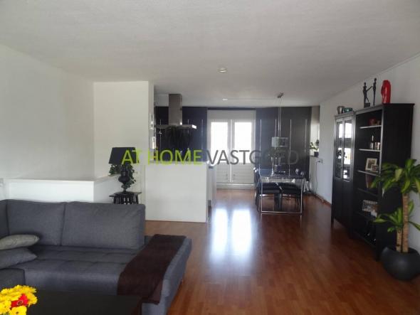 5e verdieping: Lichte woonkamer met laminaatvloer, 2x openslaande deuren naar de stijlvol aangelegde dakterrassen met fantastisch uitzicht per terras. Het terras grenzend aan de keukenkant ligt op het zuid-oosten en het terras grenzend aan de woonkamerkant ligt op het zuid-westen. Luxe open keuken, met vaatwasser, koelkast, vriezer, combi-oven, 4-pits inductie-kookplaat en RVS afzuigschouw.