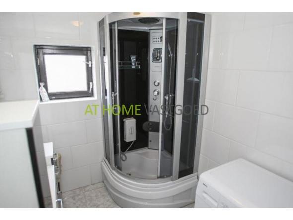 Zeer luxe geheel betegelde badkamer welke is voorzien van een wastafel met meubel, luxe douchecabine, design radiator en de aansluitingen voor de droger.
