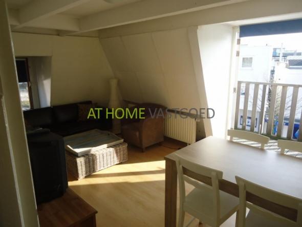 Via de keuken komt u in de woonkamer. De schuine balken in de knusse woonkamer geven het appartement sfeer. Vanaf het balkon op het zuiden kijkt u uit over de gezellige winkelstraat.