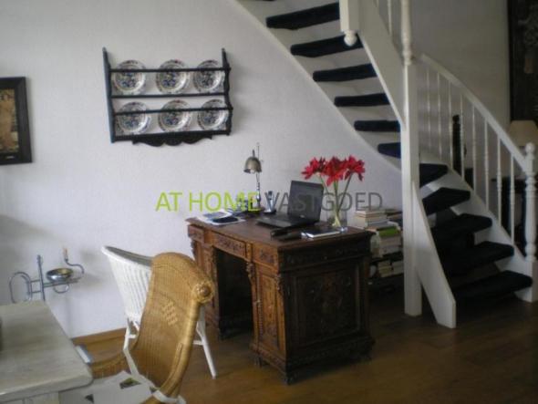 Begane grond: Bij binnenkomst ruime hal, grote woonkamer van 14 x 4 m, open keuken met inbouwapparatuur, open trap naar eerste verdieping. Via de woonkamer komt u in de riante en goed verzorgde tuin.