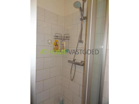 De nette badkamer met douche en toilet worden gedeeld met 1 persoon (vrouw).