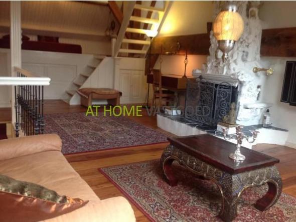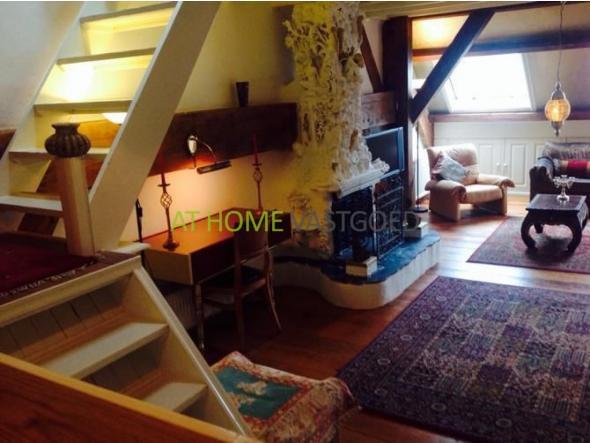 Eerste verdieping: Trap naar eerste verdieping. Ruime en lichte woonkamer met een houten vloer, houten balken en open haard. Via de trap naar de ruime ouderslaapkamer met veel bergruimte.