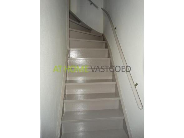 Open portiek met trappenhuis en brievenbussen.