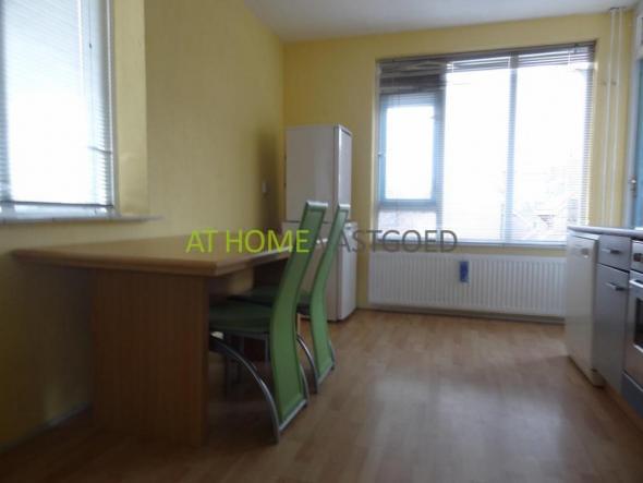 1e verdieping: de woonkamer met toegang tot het balkon, keukenruimte en eettafel. De keuken is voorzien van gas kookpit, oven, afzuigkap, vaatwasmachine, koelkast en vriezer. Het toilet bevindt zich ook op de eerste verdieping. Trap naar tweede verdieping.