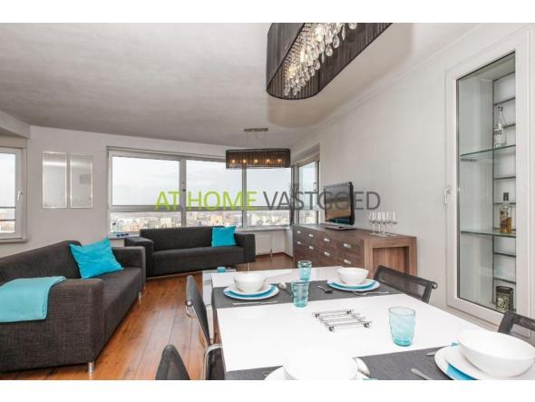 32e verdieping: entree/hal met inpandige berging en toilet. Zeer royale woonkamer van circa 44 m² met veel ramen en fantastisch weids uitzicht over Rotterdam. De woonkamer beschikt over een luxe open keuken met natuurstenen blad, kookeiland en inbouwapparatuur zoals inductie kookplaat, combi oven, vaatwasser en koel/-vriescombinatie.