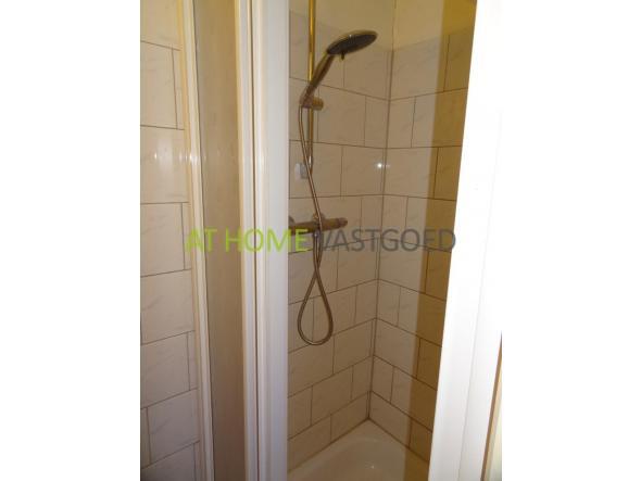 1e etage: overloop, nette badkamer met douche en toilet, gezamenlijke berging, entree studio, balkon welke te bereiken is via openslaande deuren, nette half open keuken.