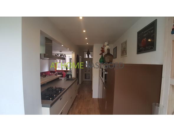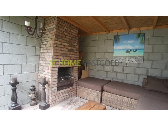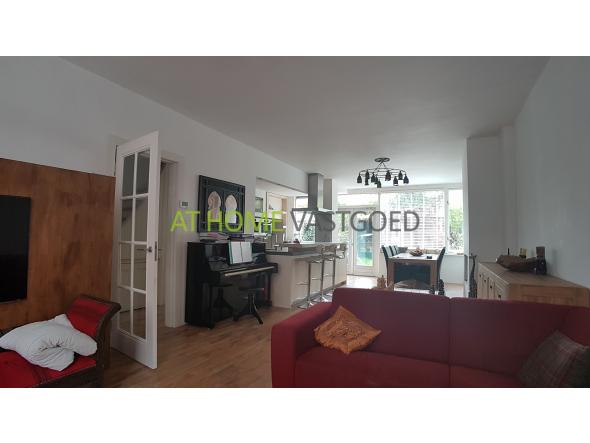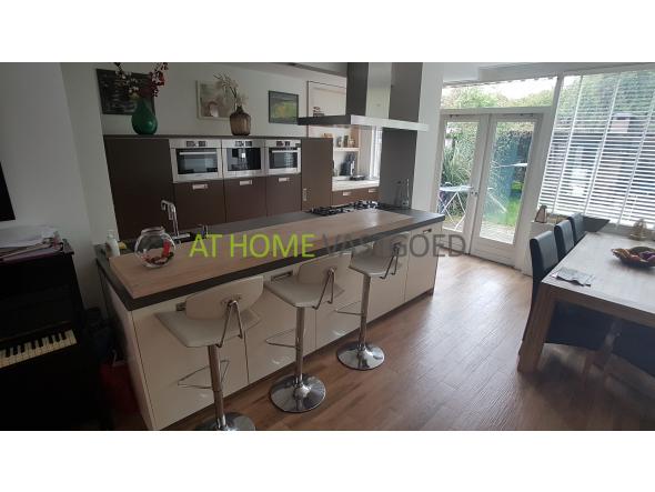 Riante woonkamer met erker, open haard en prachtige luxe moderne open keuken voorzien van alle benodigde Bosch apparatuur zoals; gaskookplaat, RVS-afzuigkap, koffiemachine, combi magentron, stoomoven, koelkast, vriezer en vaatwasser. De keuken geeft middels openslaande deuren toegang tot de riante tuin met berging en loungegedeelte met haard.