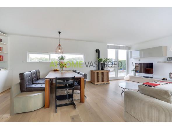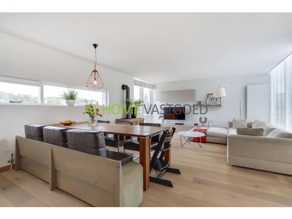 Ruime woonkamer met schuifpui naar het riante buitenterras. De gehele begane grond is voorzien van een prachtige eikenhouten vloer.