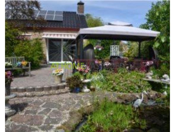 - L-vormige woonkamer met open haard en alle zijden ramen. Airco, plavuizen vloer met vloerverwarming, schuifpui naar voortuin.