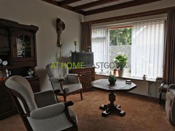 Verdieping: ruime overloop en 2 ruime slaapkamers waarvan 1 met een deur die toegang biedt naar het platte dak van de garage. Vanaf de overloop is de grote badkamer met ligbad en 2e toilet toegankelijk. Achter de knieschotten is veel bergruimte aanwezig.
