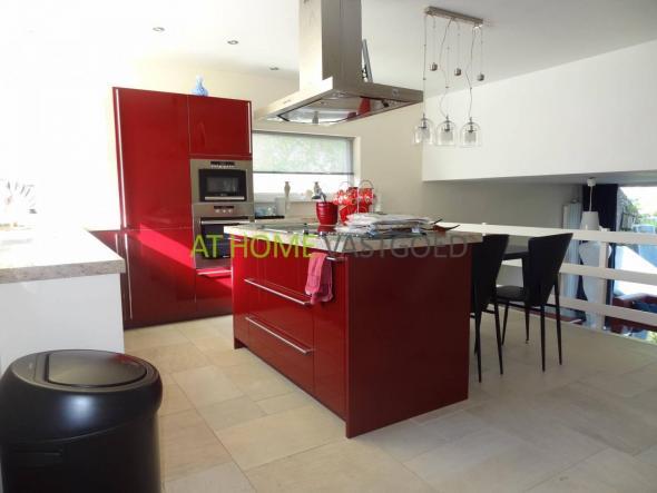De woonkeuken van circa 23,9m² is gesitueerd aan de voorzijde met een luxe opstelling in L-vorm en een kookeiland, granieten werkbladen en ingebouwde inductiekookplaat, lavagrill, rvs afzuigkap, koelkast, vriezer, vaatwasser, magnetron en oven.